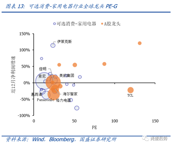 PE-G角度:A股主要龙头PE合理,业绩增速中等,PE-G下合理。A股三大家电龙头估值与全球龙头相近,部分小家电龙头PE与业绩增速均更高。