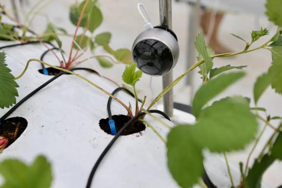 每支参赛队伍负责一个种植大棚,棚内有6条种植槽,可以种植600株草莓。科技感遍布在AI组每支队伍的大棚内,悬挂在大棚支架上的摄像头、种植槽上方的温湿度监控装置,还有土壤里的传感器,大棚内任何一点微小的变化,都在第一时间被传回了后方数据收集设备。