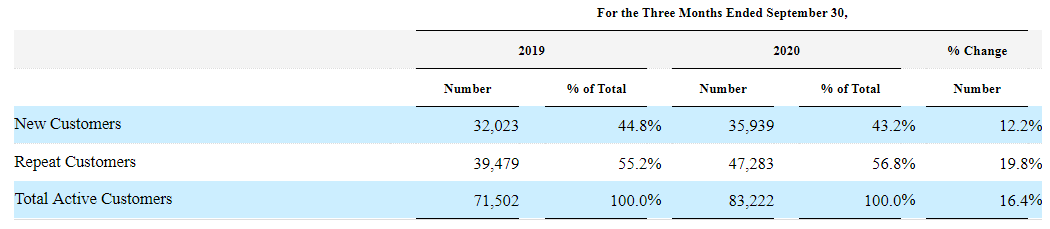 不过,值得关注的是,虽然活跃客户总数呈现双位数增长,给该公司带来消费频次及收入的增加,但该季度毛利率为63.9%,相较2019年第三季度的毛利率69.1%而言,下降了5.2个百分点。这或表明,消费人数及频次的增加与总收入形成正相关的关系,但由于毛利率的同比下滑,当期利润并没有与总收入呈现同向增长态势。