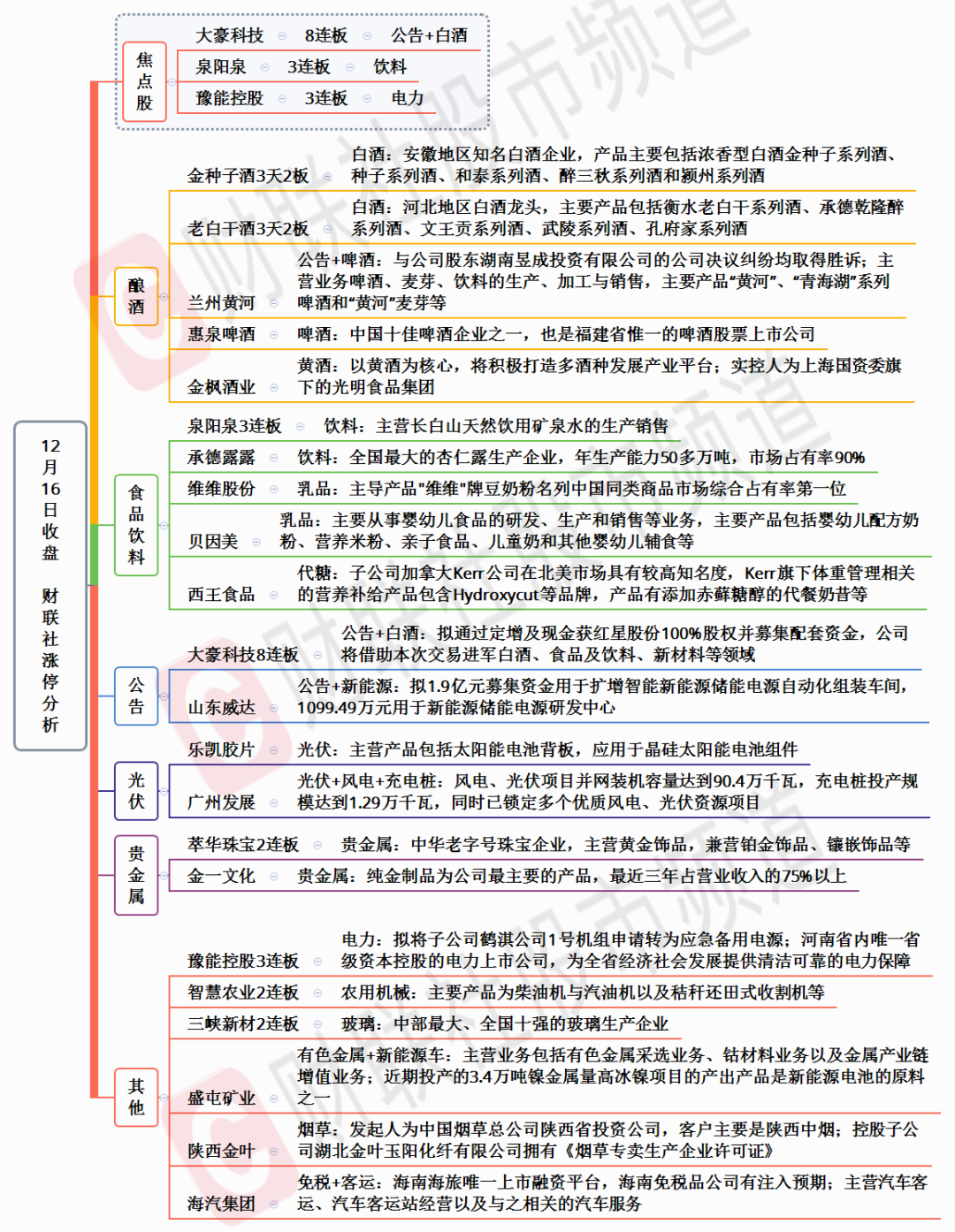 财联社12月16日讯,今日共23股涨停,20股封板未遂,封板率为53%;大豪科技8连板,皇台酒业摘帽复牌大涨315%,泉阳泉、豫能控股3连板,金种子酒、老白干酒均3天2板。盘面上,收涨个股近1000只,收跌个股近3000只;酿酒、食品、酒店餐饮等涨幅居前,注册制新股、汽车整车、通信设备、半导体芯片等跌幅居前。