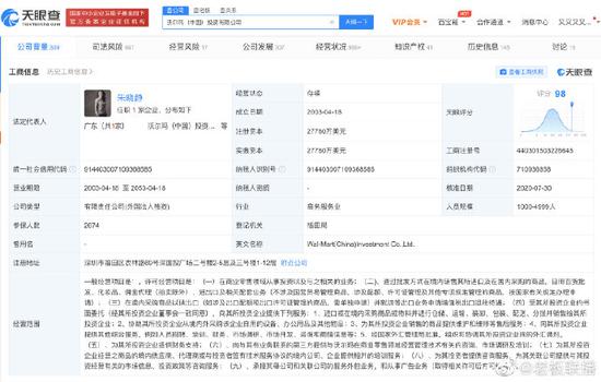 沃尔玛(中国)投资有限公司成立于2003年4月,注册资本为2.776亿美元,法定代表人为朱晓静,经营范围包含在商业零售领域从事投资以及与之相关的业务,通过批发方式在境内销售其所进口及在国内采购的商品,日用百货批发、化妆品等。该公司由沃尔玛中国有限公司全资持股。