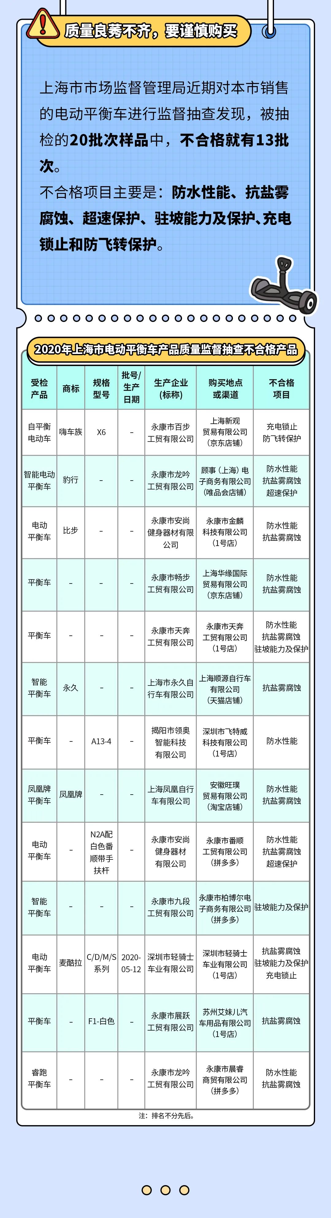 【监管】沪抽查20批次电动平衡车,这13批次不合格