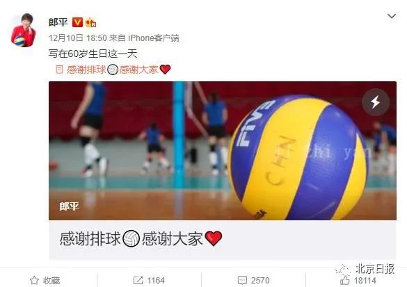 值得一提的是,整整一周前的12月10日,是郎平60岁的生日。当天,她在个人微博上发布了题为《感谢排球 感谢大家》的生日感言,文中写道:“真是发自内心感谢排球,让我认识了这么多朋友。我能坚持到现在,也得益于大家对我的支持和鼓励。因为热爱,走到现在,也因为热爱,还会继续向前走。”