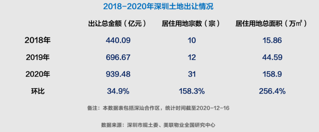 据美联物业全国研究中心统计,2020年深圳共卖地约939.48亿元,金额为近3年最高。居住用地宗数为31宗,超出2018年和2019年宅地宗数之和。