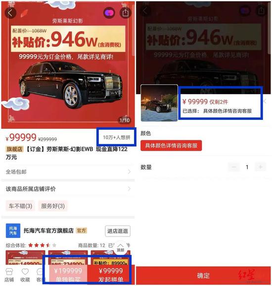 此前,拼多多平台一家名为“托海汽车官方旗舰店”的店铺挂图售卖劳斯莱斯幻影,配置价为1068万元的劳斯莱斯幻影直降122万元,补贴后仅需946万元(含消费税)。