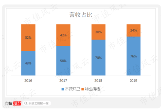 因此,市政环卫的占比得到迅速提升,从2016年的48%上升至2019年的76%,成为收入的绝对来源。