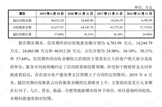 而且公司的招股说明书介绍,由于公司的客户大部分为政府单位,受制于财政资金支付审批流程较长,有部分客户服务费支付周期大于合同约定的情况,因此公司应收账款中超信用期余额占比较大,而且还在逐年提升。