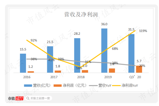 2016-19年,以及2020年三季度,公司实现营收分别为15.5亿、21.5亿、28.2亿、36.00亿和31.5亿。以2016年为基准,截止2019年营收CAGR为32%,增长还算不错。