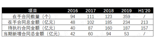 2016年至2019年,公司的当期新增合同总金额分别为42亿、60亿、94亿和53亿,2019年首次出现同比大幅下降。