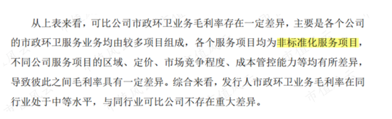 据公司的招股书介绍,公司与可比公司的市政环卫业务毛利率存在一定的差异,是由于各个公司的市政环卫服务业务均由较多项目组成,各个服务项目均为非标准化服务项目。