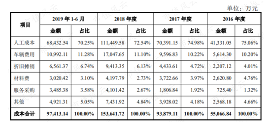 其次分别为车辆费用、折旧摊销、材料费和服务采购,占比分别为10%、6%、3%和3%左右。