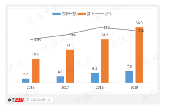 我们再来看影响公司现金流状况的主要指标应收账款,2016年至2019年,应收账款规模随营收规模扩大而稳定扩大,占营收比例有所提升,由18%提升至21%。