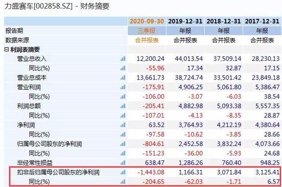 力盛赛车的股价长期下跌,与业绩走低不无关系。Wind数据显示,上市之后,除了2017年当年扣非归母净利润同比略微上行之外,2018年和2019年均同比下滑,2019年的同比下滑幅度达到62%。2020年前三季度扣非归母净利润更是出现亏损,同比下滑超过200%。