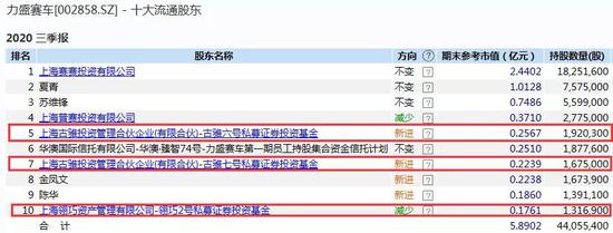 不过,“韩寒概念股”的头衔也让力盛赛车受到了新成立的私募基金的关注。Wind数据显示,力盛赛车2020三季报前十大流通股东中,新进了同一私募基金公司旗(金麒麟分析师)下于8月刚成立的两个产品,即上海古雅投资管理合伙企业(有限合伙)旗下的古雅六号和古雅七号,分别成立于8月5日和8月24日,持有192万股和167.5万股,位列第5和第7大流通股东。