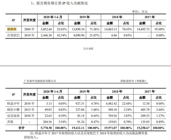 数据显示,2017年~2019年,“猪猪侠”IP收入分别约为1.45亿元、1.41亿元、1.39亿元,占当年收入的比重分别高达95.00%、70.43%、71.56%,为公司收入贡献最大的 IP。2020年1~6月,“猪猪侠”IP收入则为3053.64万元,占比超过一半。
