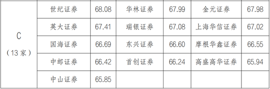 此次评价结果评为C类的券商总计13家。其中中山证券得分65.85分,排名垫底;高盛高华证券得分65.94分,排名第86;首创证券得分66.24分,排名第85。