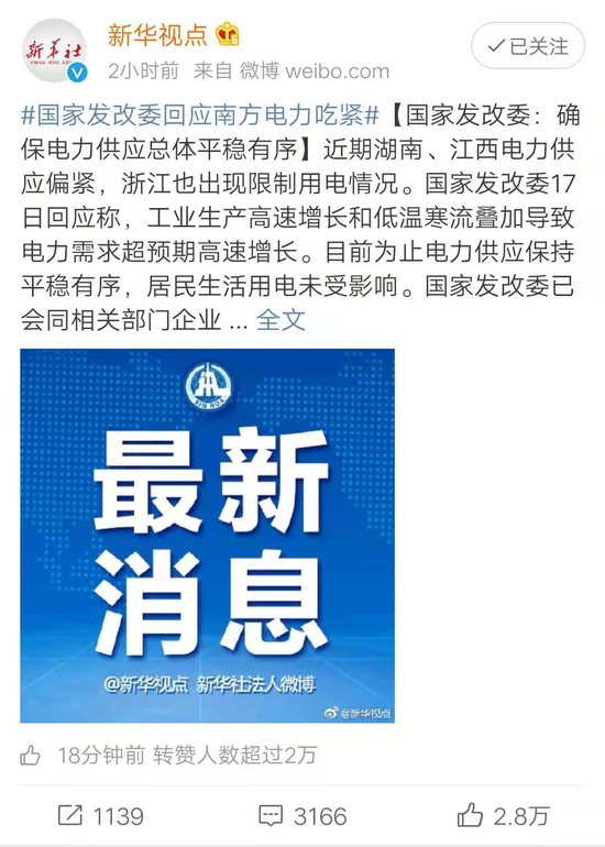 近期湖南、江西电力供应偏紧,浙江也出现限制用电情况。国家发改委17日回应称,工业生产高速增长和低温寒流叠加导致电力需求超预期高速增长。目前为止电力供应保持平稳有序,居民生活用电未受影响。国家发改委已会同相关部门企业,采取措施切实保障电力需求,确保电力供应总体平稳有序。