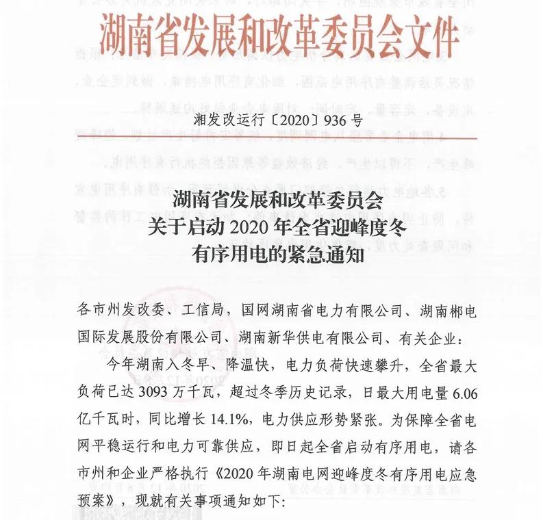 12月8日,湖南省发改委发布了《关于启动2020年全省迎峰度冬有序用电的紧急通知》,通知中称,全省最大负荷已达3093万千瓦,超过冬季历史纪录,日最大用电量6.06亿千瓦时,同比增长14.1%,电力供应存在较大缺口,这种情况预计将持续到明年春节前后。为保障全省电网平稳运行和电力可靠供应,湖南启动有序用电。