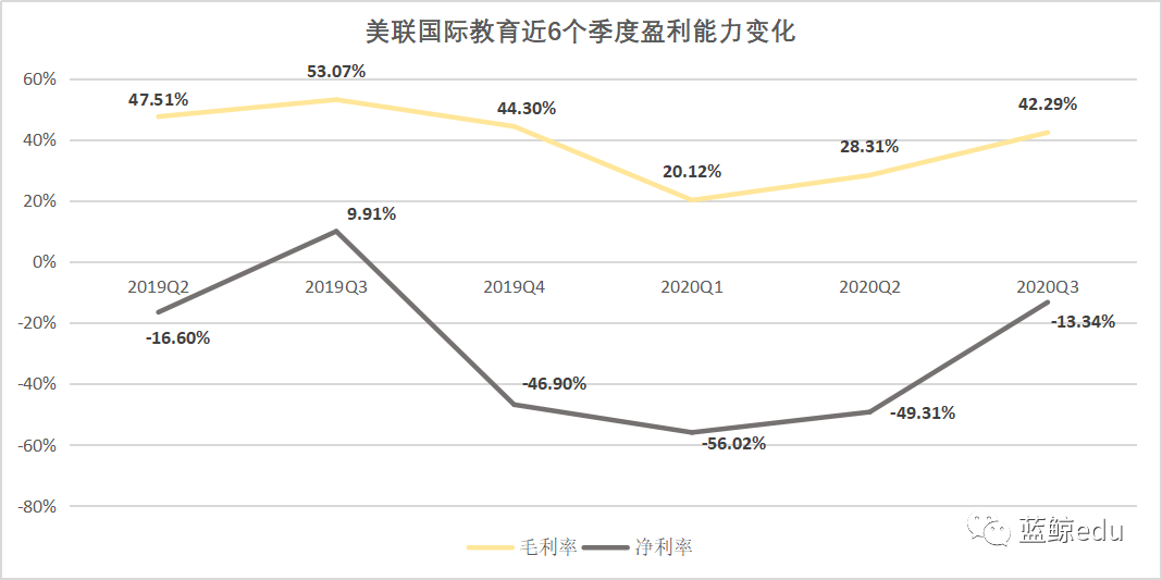上市后的美联国际教育的毛利率也陷入谷底,从2019年的45%左右大幅下滑到20%,三季度,美联国际教育的毛利率虽然有所回升,但仍未达到去年的水准。