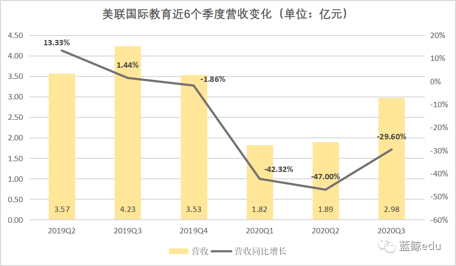 美联国际教育2020财年前3个季度营收仅为6.69亿元,该公司的Q4营收需达到7.79亿元才能与2019年营收持平,从目前的状态来看,2020财年营收可能还会出现大幅下滑。
