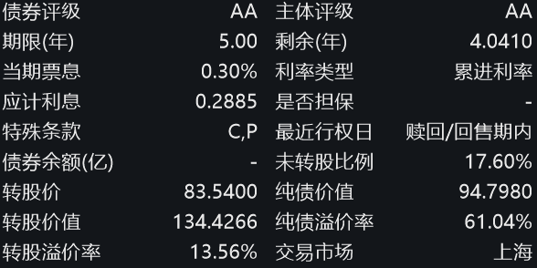 按最新转股价83.54元测算,每张转债的转股价值为100/83.54*112.3=134.43元,与最新转债价格相比,转股溢价率13.56%,即按上午收盘价转股后会损失13.56%。