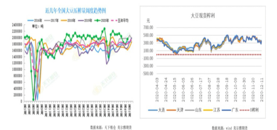 而在此番需求之下,厂家将抓住油脂价格的赚钱效应,大量压榨大豆,与此同时,相对应豆粕的市场存量也会增加,随着年关将至,厂家“挺油抛粕”心理越来越强,豆粕库存或有累积预期。