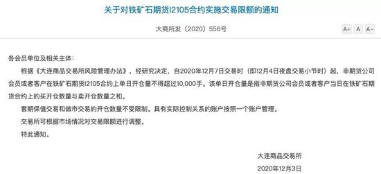 12月3日,大商所发布公告称,根据《大连商品交易所风险管理办法》,经研究决定,自2020年12月7日交易时(即12月4日夜盘交易小节时)起,非期货公司会员或者客户在铁矿石期货I2105合约上单日开仓量不得超过10,000手。该单日开仓量是指非期货公司会员或者客户当日在铁矿石期货合约上的买开仓数量与卖开仓数量之和。