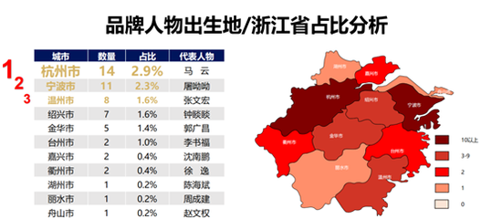 浙江省:在《2020中国品牌人物500强》品牌人物中,共有54个品牌人物出生在浙江省,其中出生在杭州市的品牌人物有14名,占榜单总数的比例是2.9%;其次为宁波市拥有品牌人物11人,占榜单总数的比例是2.3%,是浙江省品牌人物最多的出生城市。温州市、绍兴市、金华市、台州市、嘉兴市、衢州市、湖州市、丽水市和舟山市分别位列浙江省品牌人物出生城市的第3名到第11名,分别有8名、7名、5名、2名、2名、2名、1名、1名和1名品牌人物上榜。