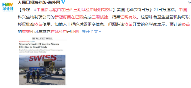 美国报道称,中国科兴生物制药公司的新冠疫苗在巴西完成三期试验,结果证明有效,这意味着卫生监管机构可以授权批准疫苗使用。
