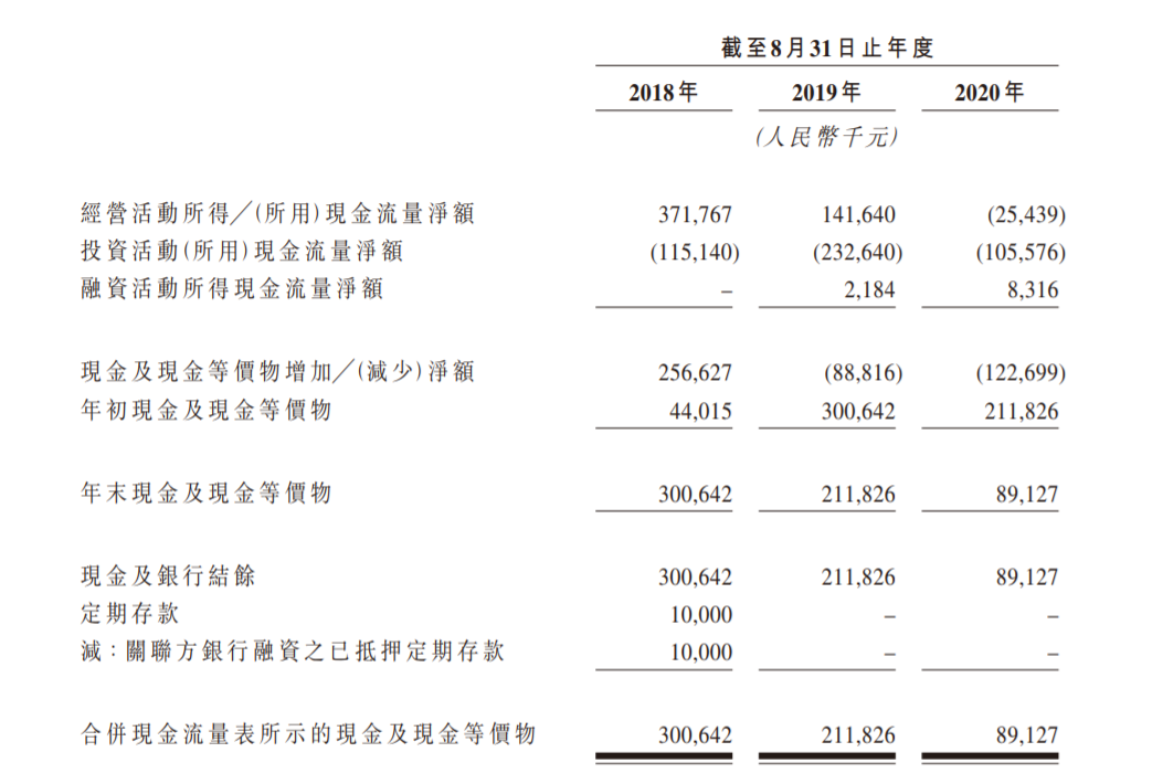 财报显示,最近三个财年通才教育经营活动的现金流量净额分别是3.72亿元、1.42亿元以及-2544万元——2020财年通才教育的现金流为负。与此同时,截至今年8月31日通才教育的现金及现金等价物为8912.7万元,而截至2019年8月31日这一数字为2.12亿,一年间缩水了57.9%。而2018年则更是超过3亿元,今年与2018年相比缩水了超7成,这并不是一个积极的信号。
