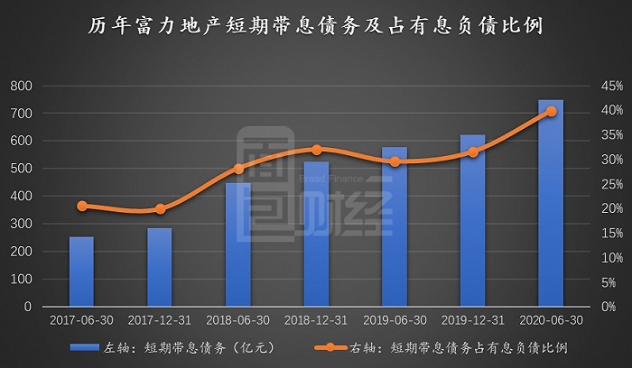 截至2020年6月末,富力地产有息负债规模为1877.4亿元。其中短期带息债务规模为748.03亿元,占公司有息负债的比例为39.84%,较2019年年末增长8.26个百分点。同期,公司货币资金仅为179.02亿元,较2019年年末下降21.84个百分点。短期带息债务的规模及占有息负债的比例增加,叠加销售数据较大幅度的回落,公司面临一定的短期偿债压力。