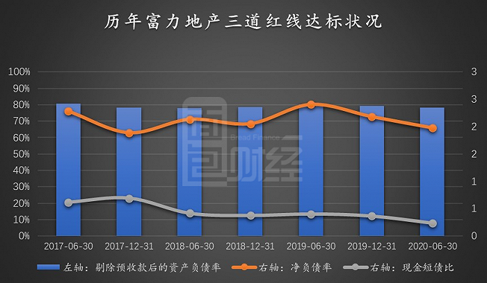 截至2020年6月末,富力地产剔除预收款后的资产负债率为78.16%,净负债率为197.73%,现金短债比为0.23倍。三项指标均不满足监管要求,财务归属“红色”阵营。
