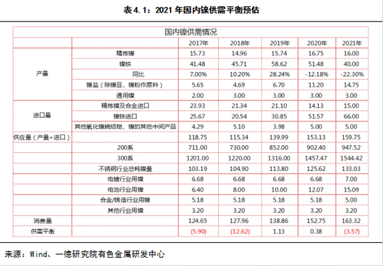 根据以上供应以及需求端的描述,我们对2021年全球范围内镍供需情况作了预估,如下表所示,从预估数据可以看出,2021年镍处于供大于需的概率较大,但是由于需求强劲增幅较大导致2021年供应过剩情况会缓于2020年。