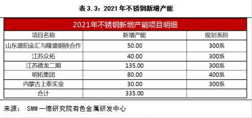 国不锈钢产能仍处于扩张状态,根据SMM数据, 2020年新增产能项目为临沂钢铁投资集团一期项目,年产能70万吨300系不锈钢,同时有222万吨产能退出用于新增产能的置换。2021年,新增产能预计总计约335万吨,其中出明拓集团计划生产400系外,主要增加系别均为300系不锈钢产能。 2022年之后,不锈钢产能将计划再新增约1864万吨,总产能达5767万吨。除内蒙古奈曼经安已经公布建设时间外,其他大部分均处于筹划阶段或是在计划中,并未明确建设间。