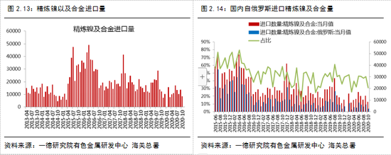 根据已知数据和对12月份产量的预估,我们预计2020年硫酸镍总产量达到14.2万金属吨。对于明年硫酸镍的消费,我们认为在国内外政策均大力刺激新能源汽车消费的背景下,新能源汽车产业电池用镍前景乐观。从长期看,电池用镍在未来将成为影响镍价的重中之重。
