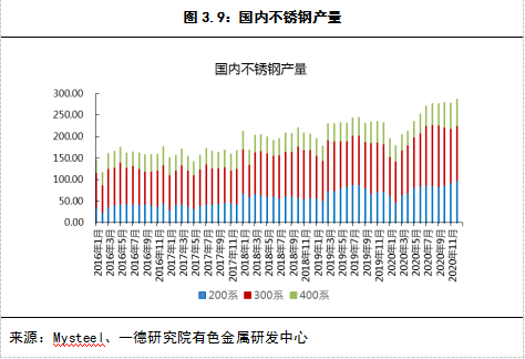 年内总产量预计有望达到3130万吨,同比增幅6.46%,其中300系产量1500万吨,占比48%,2021年新增产能较多(新增产能能否落地我们暂不考虑),随着新增产能的释放,2021年不锈钢市场形势将更加严峻, 根据新增产能以及产能利用率,我们预估2021年我国不锈钢产量有望达到3300万吨以上,同比增幅在百分之六上下。