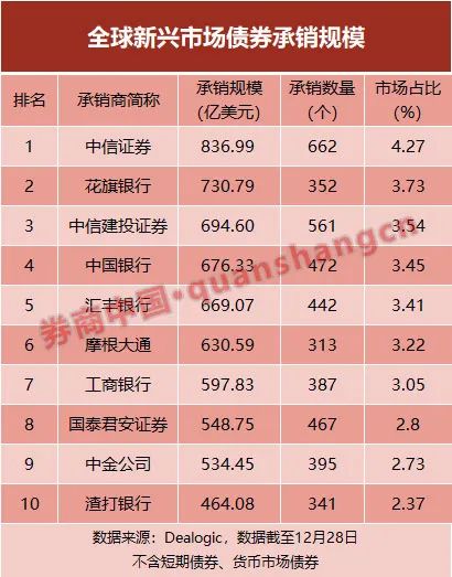 在全球新兴市场债券承销规模的排名中,中信证券、中信建投、国泰君安、中金公司4家跻身前十榜单。2020年中资券商承销中资企业境外债规模前三分别为海通证券、中金公司及国泰君安,三家券商的承销规模均超过50亿美元。