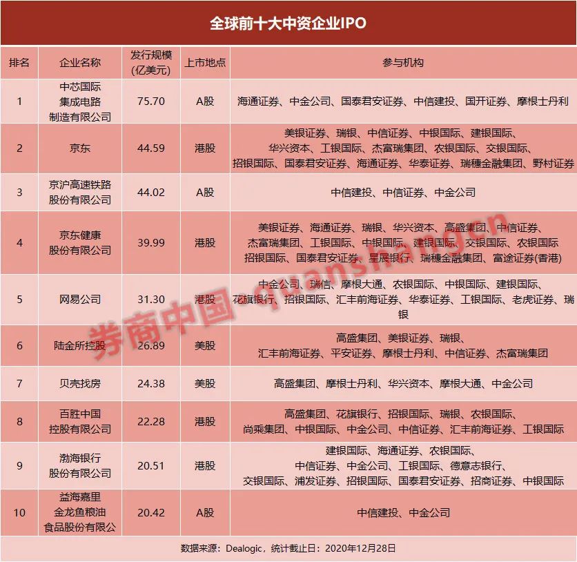 盘点来看,中芯国际的科创板IPO成为2020年全球中资企业融资规模最大的IPO项目,中金公司、海通证券为其保荐机构。在2020年全球股本市场中资企业前十大交易榜单中,中资券商同样身影频现。