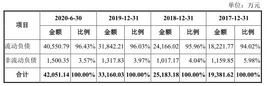 报告期各期末,公司流动负债占负债总额的比例分别为94.02%、95.96%、96.03%和96.43%。