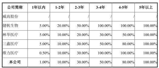 健帆生物、林华医疗、三鑫医疗1年以内应收账款坏账计提比例均为5%,维力医疗为0.5%,百合医疗1年以内应收账款坏账计提比例为1%。