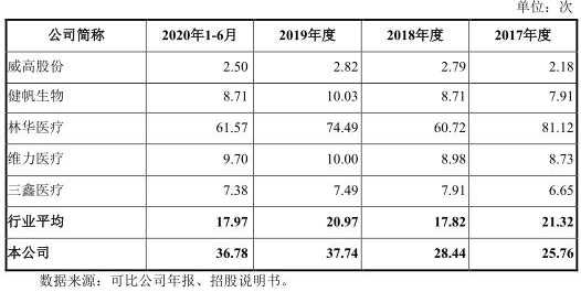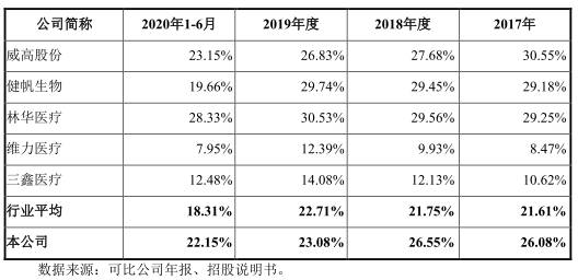 2017年至2020年1-6月,百合医疗毛利率分别为61.04%、61.18%、60.93%、56.37%,去年和2020年上半年毛利率下降。同行业可比公司平均毛利率分别为57.17%、56.82%、60.36%、58.24%。