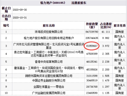 截至三季度末,广州市玄元投资管理有限公司-玄元投资元宝1号私募投资基金持有格力地产8185.97万股,占流通股比例为3.972%,是其第三大流通股股东。