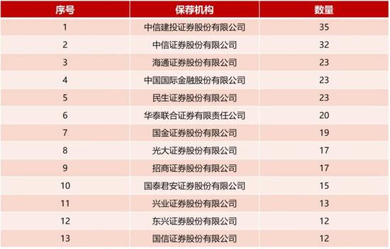 东方花旗证券/东方证券、国元证券承揽9家,安信证券承揽8家,西部证券、东吴证券、浙商证券7家,广发证券、申万宏源、长江证券承揽6家,申港证券、中德证券承、东莞证券、中国银河揽5家,财通承揽4家,华创证券、华林证券、平安证券、华西证券、中泰证券承揽3家,德邦证券、第一创业、国都证券、华安证券、首创证券、天风证券、信达证券、中山证券、中银国际承揽2家,渤海证券、东海证券、国海证券、红塔证券、华龙证券、华融证券、华英证券、南京证券、瑞信方正、瑞银证券、湘财证券、长城证券、民族证券、中天国富、爱建证券、中航证券承揽1家。