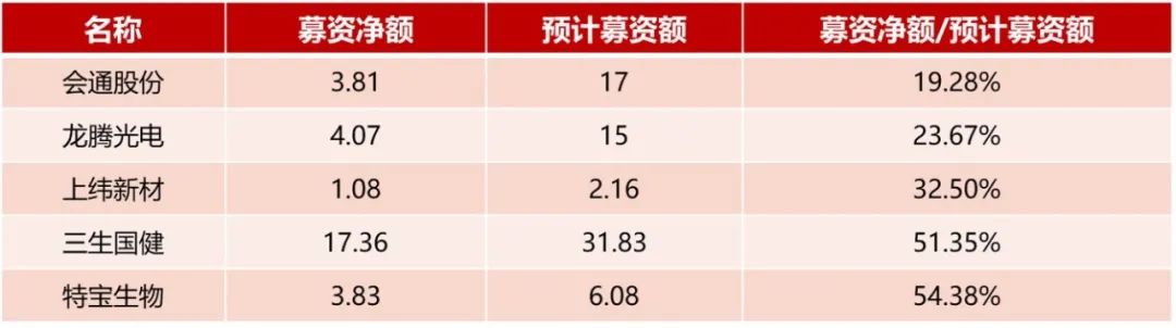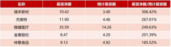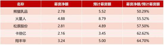 注册制的创业板63家中,25家尚未募足,占39.68%,其中熊猫乳品募资净额仅为预计募资金额的50.29%,而超募企业中,瑞丰新材募资净额与预计募资金额比高达306.42%。