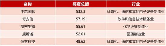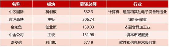 今年影响力较大的几家上市公司,分别位于上海、北京等地区,其中,上海的中芯国际、金龙鱼,北京的京沪高铁、中金公司,募资都是排在前5名(募资排名见下文)。