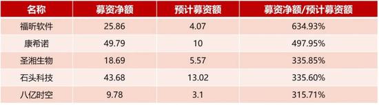 从募资净额来看,科创板145家企业中,有53家尚未募足,占36.55%,其中会通股份募资净额仅为预计募资金额的19.28%,而超募比例最高的是福昕软件,募资净额与预计募资金额比高达634.93%。