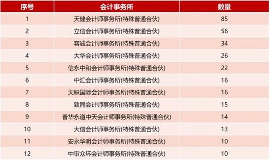 德勤华永、瑞华、众华均有8家,天衡7家,立信中联、中天运均有6家,正中珠江5家,公证天业4家,毕马威华振、华普天健均有3家,上海上会、四川华信(集团)、苏亚金诚、中兴财光华、中兴华、福建华兴、和信均有2家,希格玛、永拓均有1家。