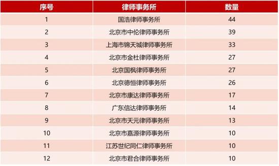 北京竞天公诚、浙江天册均承揽9家,北京海润天睿、湖南启元为8家,安徽承义为7家,安徽天禾、上海方达均为6家,北京观韬中茂、北京金诚同达、广东华商、上海瑛明均为5家,北京大成、上海广发、上海通力均承揽4家,北京德和衡、北京通商、广东广信君达、浙江六和、北京君泽君、北京环球均承揽2家,北京安杰、北京隆安、北京懋德、北京高朋、北京海问、北京金开、北京君致、北京普华、北京鑫河、北京中瑞、北京雍行、北京植德、福建至理、广东恒益、广东精诚粤衡、广东竞德律、江苏泰和、江苏益友天元、江西华邦、山东德衡、上海澄明则正、上海嘉坦、上海金茂凯德、上海嘉华、上海联合均为1家。