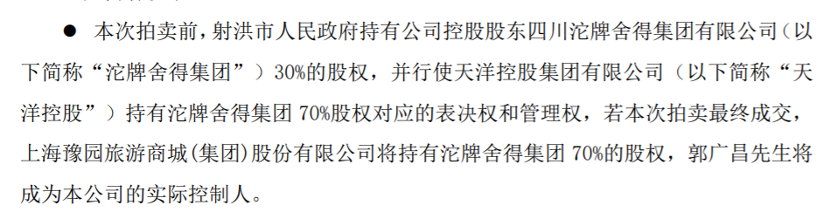 公司表示,本次拍卖前,射洪市人民政府持有沱牌舍得集团30%的股权,并行使天洋控股持有沱牌舍得集团70%股权对应的表决权和管理权,若本次拍卖最终成交,豫园股份将持有沱牌舍得集团70%的股权,郭广昌将成为公司的实际控制人。