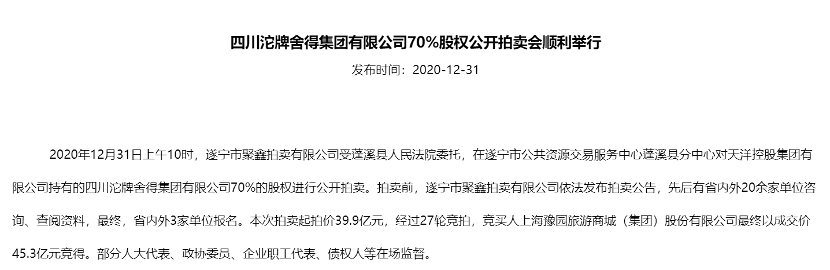 12月31日上午10时,遂宁市聚鑫拍卖有限公司受蓬溪县人民法院委托,在遂宁市公共资源交易服务中心蓬溪县分中心对天洋控股持有的沱牌舍得集团70%的股权进行公开拍卖。拍卖前,遂宁市聚鑫拍卖有限公司依法发布拍卖公告,最终,有3家单位报名拍卖。本次拍卖起拍价39.9亿元,经过27轮竞拍,竞买人豫园股份最终以成交价45.3亿元竞得。